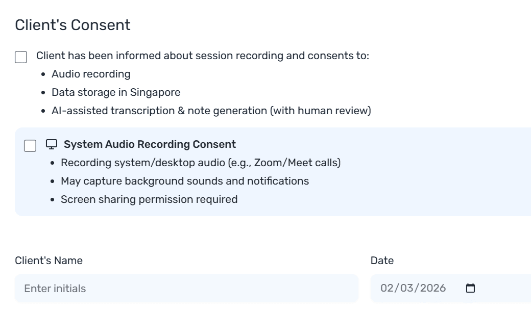 Kapacia records explicit client consent before conversations are documented, ensuring organizations maintain proper authorization for sensitive records.