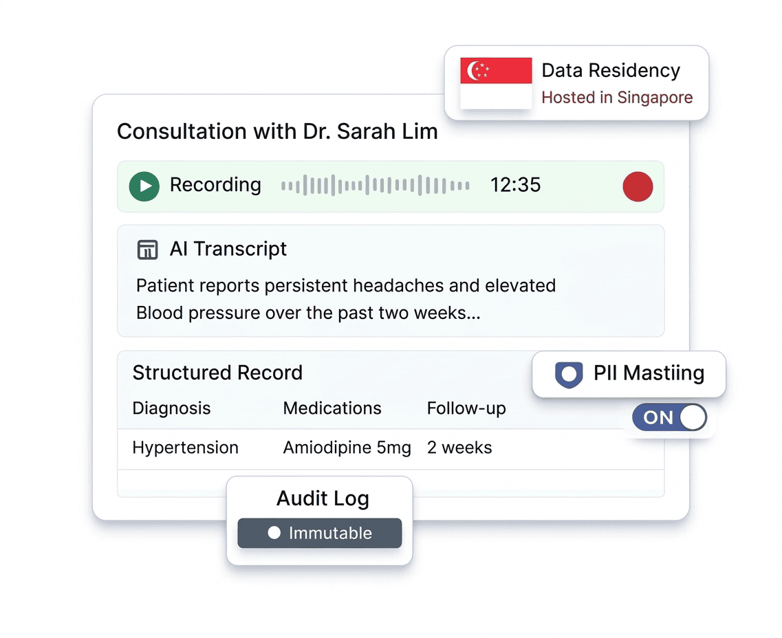Kapacia uses privacy-first AI transcription to convert consultations into structured documentation — with local data residency, PII protection, and verifiable audit trails.