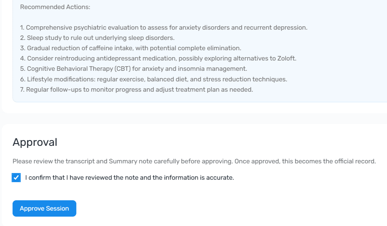 AI transcripts must be reviewed and confirmed by a human before becoming official records, ensuring accuracy and accountability.